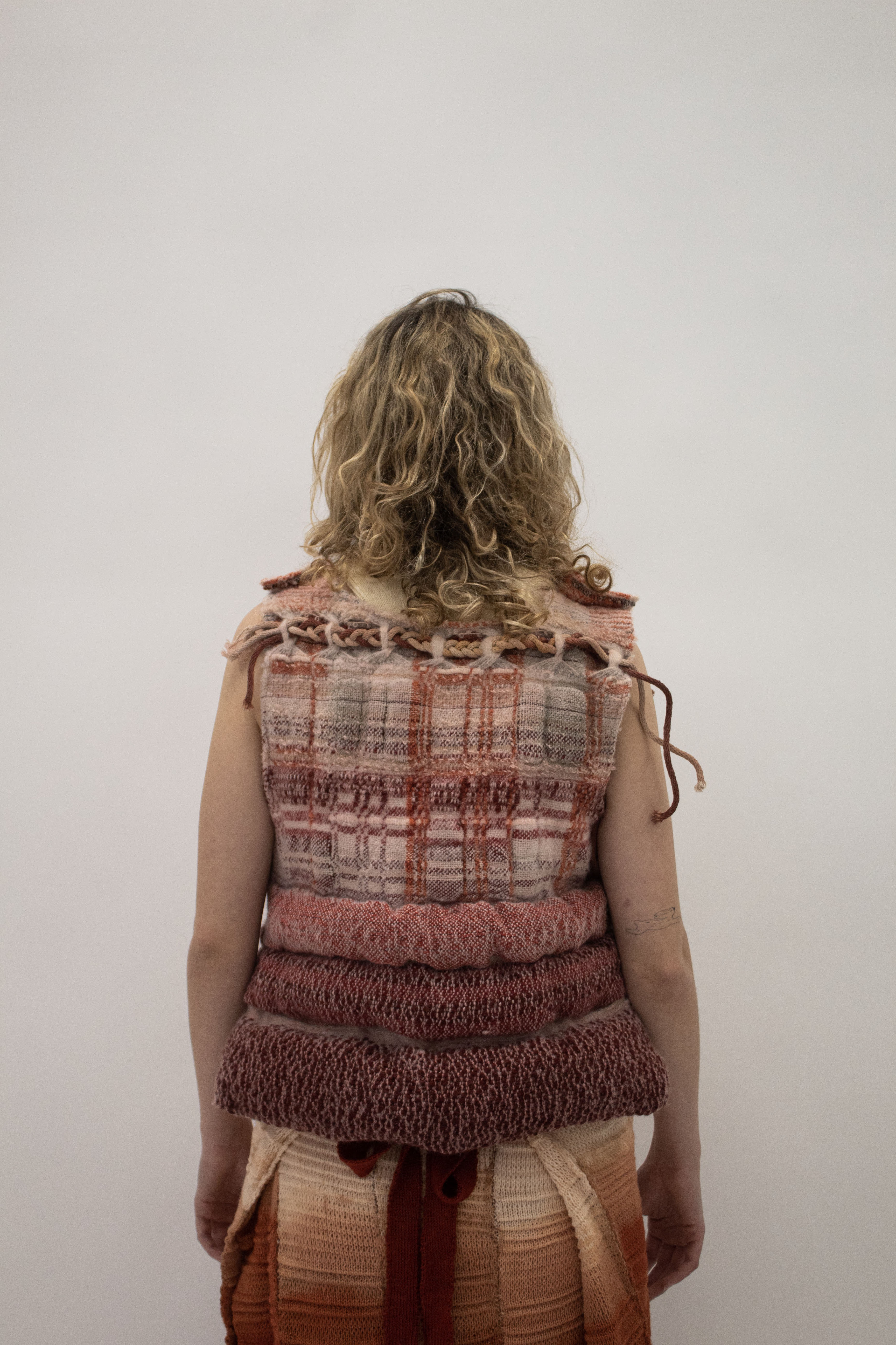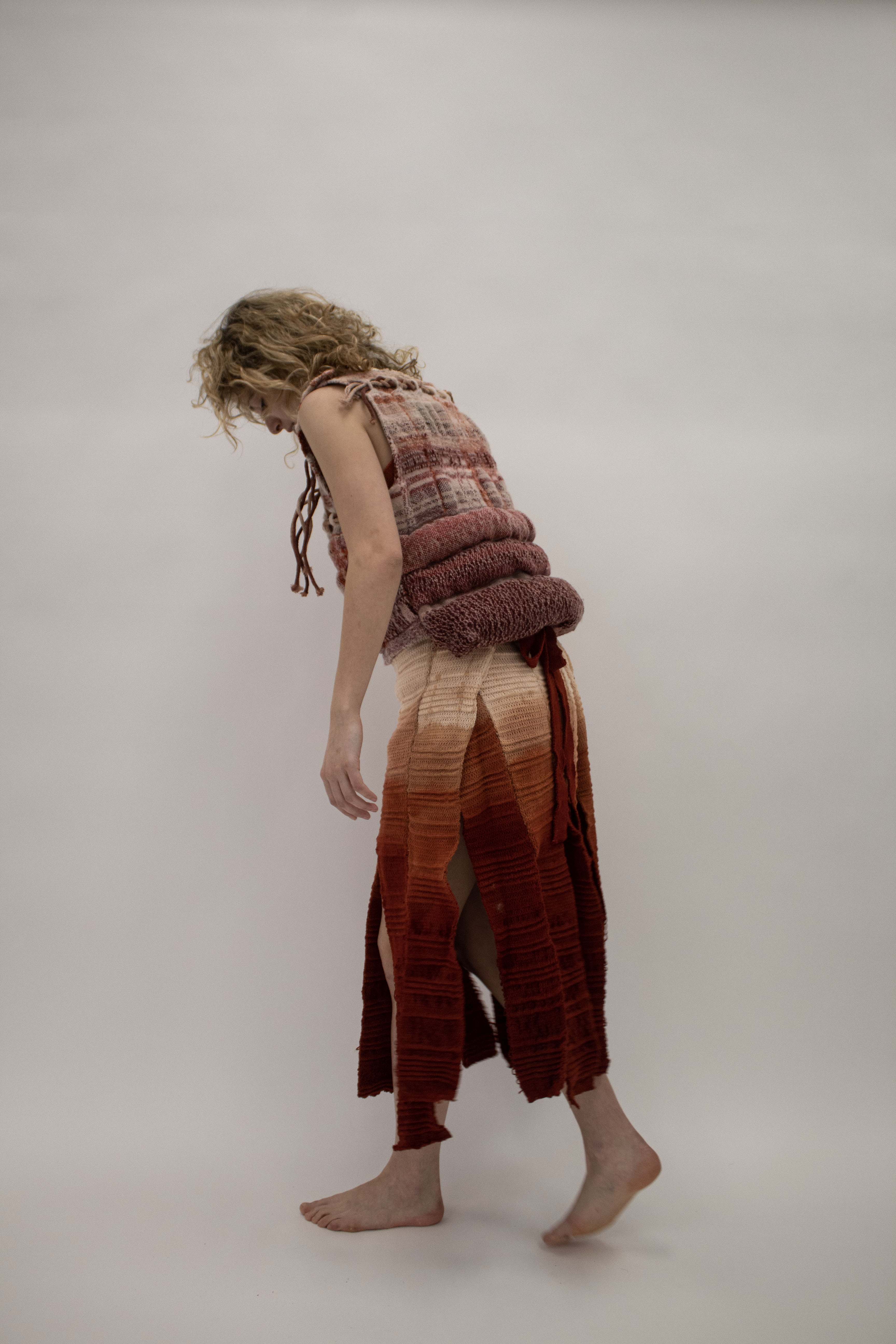 Woven and knit wool, madder dye, cotton rope, persimmon dye